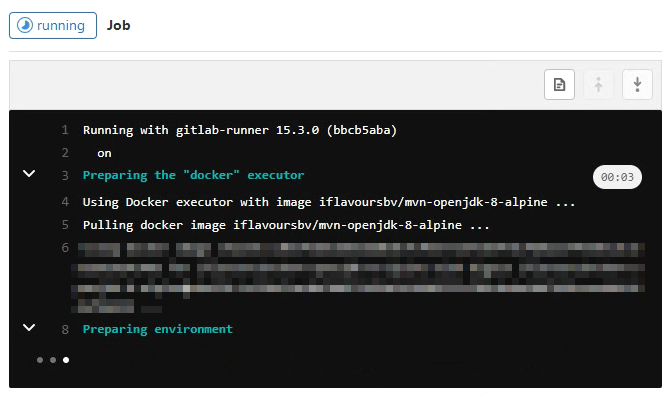 - Gitlab에 돌아와서 파이프라인 실행해보면 iflavoursbv/mvn-openjdk-8-alpine docker image로 실행되는것을 확인할 수 있다.