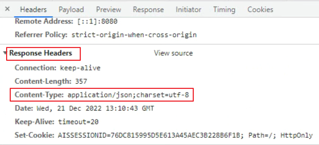 - 응답헤더(Response Headers)에 캐릭터셋이 ISO-8859-1 로 되어있다.