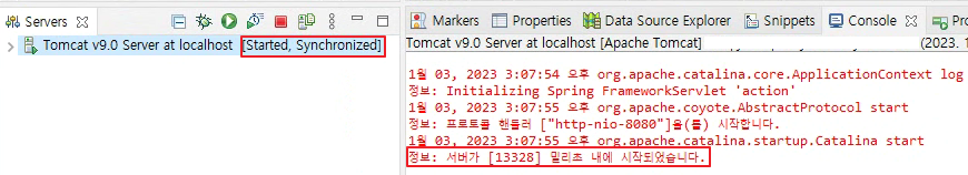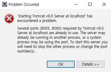 - localhost에서 Tomcat v9.0 Server에 필요한 여러 포트(8005, 8080)가 이미 사용 중입니다. 서버가 이미 다른 프로세스에서 실행 중이거나 시스템 프로세스가 포트를 사용 중일 수 있습니다. 이 서버를 시작하려면 다른 프로세스를 중지하거나 포트 번호를 변경해야 합니다.