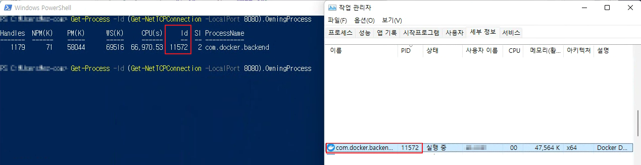 - 작업관리자를 켜고 세부정보에 가서 해당 PID를 사용하고 있는게 무엇인지 확인 해보면, 저같은 경우에는 docker가 사용하고 있었네요..