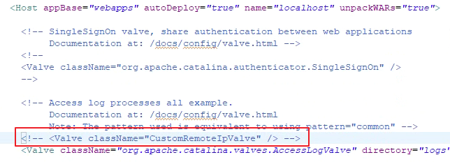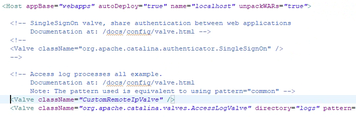 - 그리고 tomcat의 server.xml 파일을 열어 host아래에다가 CustomRemoteIpValve 를 추가합니다