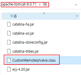 - 톰켓 구동시 참조할 수 있도록 톰켓 lib폴더에 CustomRemoteIpValve.class파일을 복사해서 붙여넣습니다.