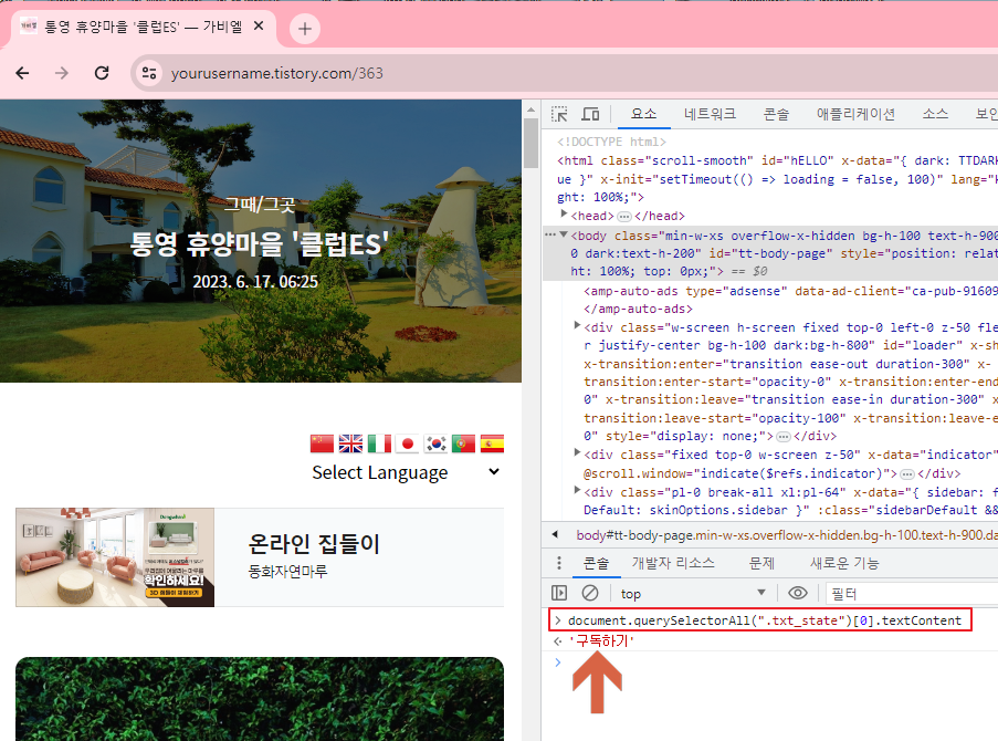 - 티스토리 블로그에 방문한 다음, 개발자 도구를 활성화시키고 콘솔창에서 아래 명령을 실행시켜 줍니다.
