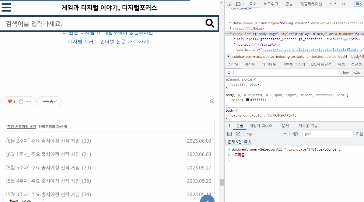 - 저는 해당 블로그를 구독중이기 때문에 콘솔창에서 document.querySelector(".btn_subscription").click(); 을 실행하면 구독해제가 됩니다.
