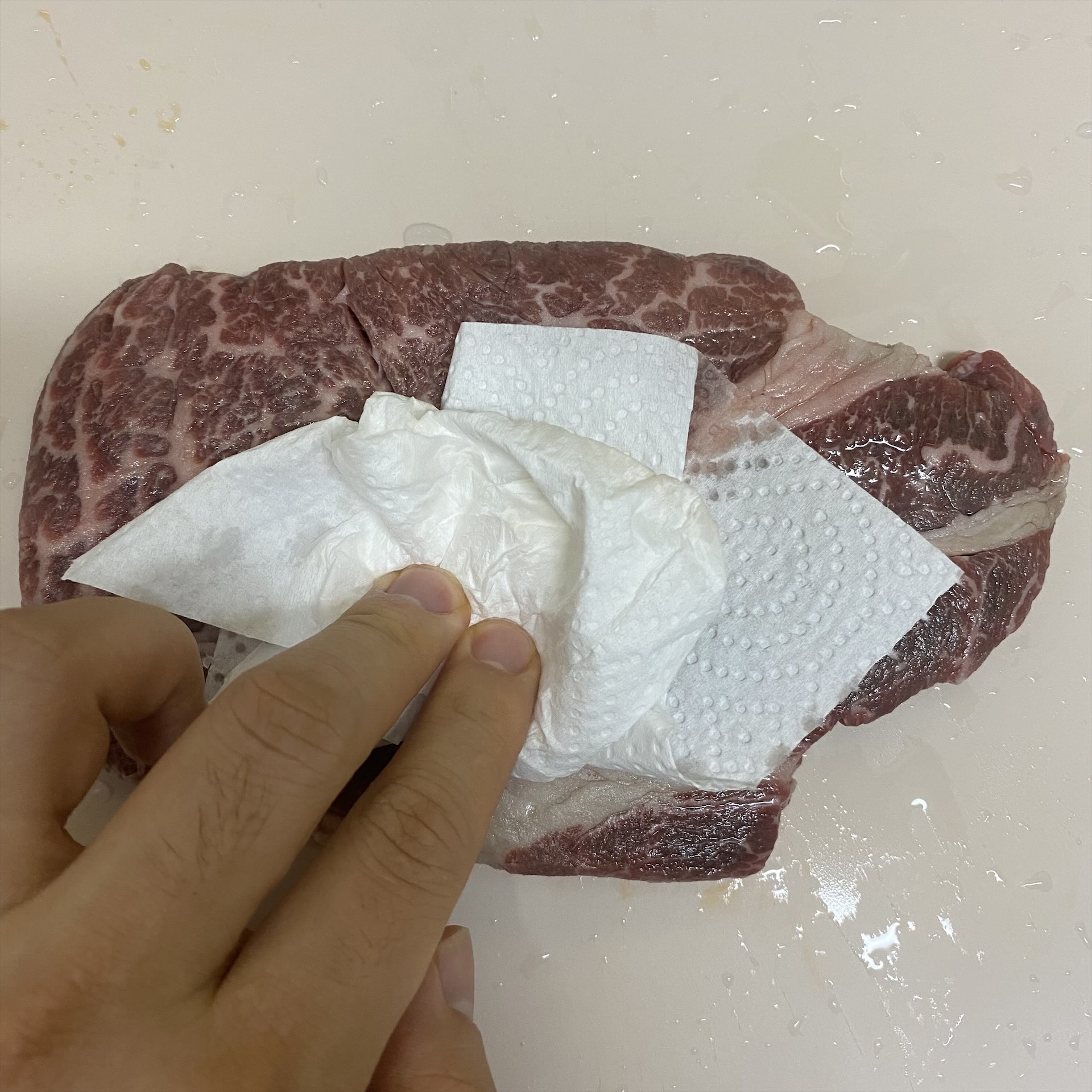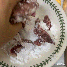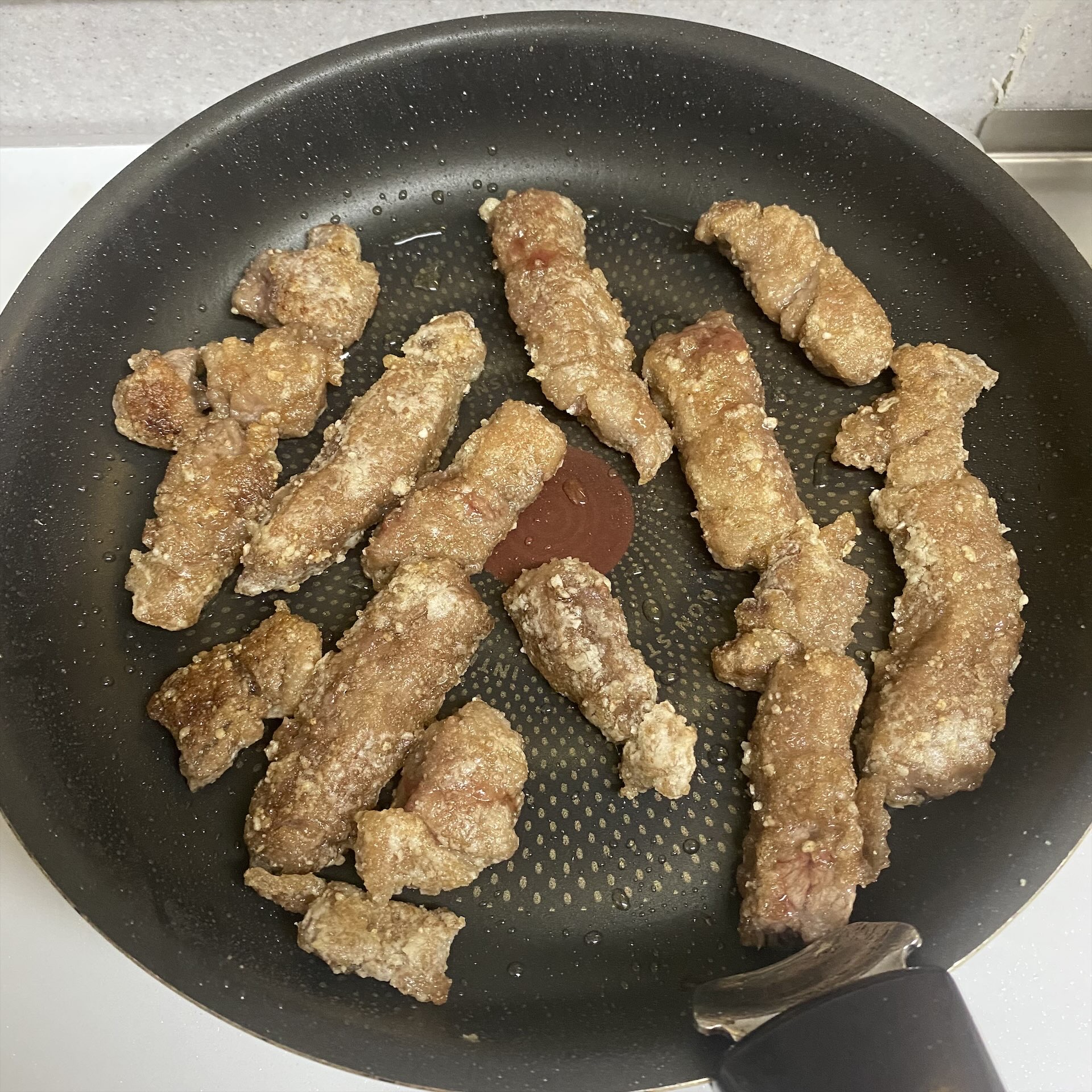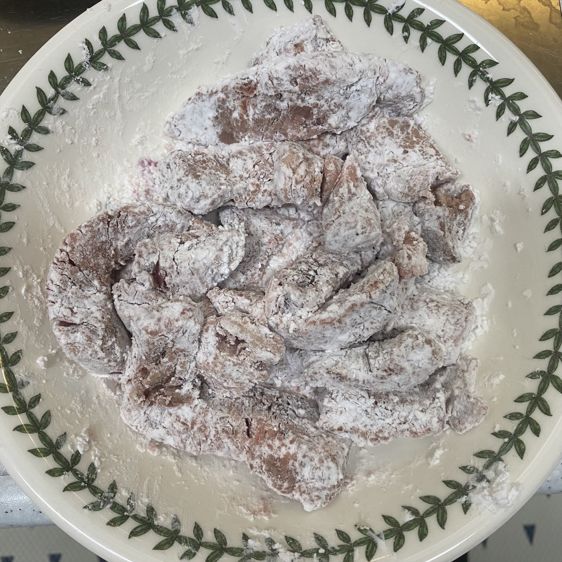 등심을 얇게 썰어 감자전분을 묻혀줍니다.