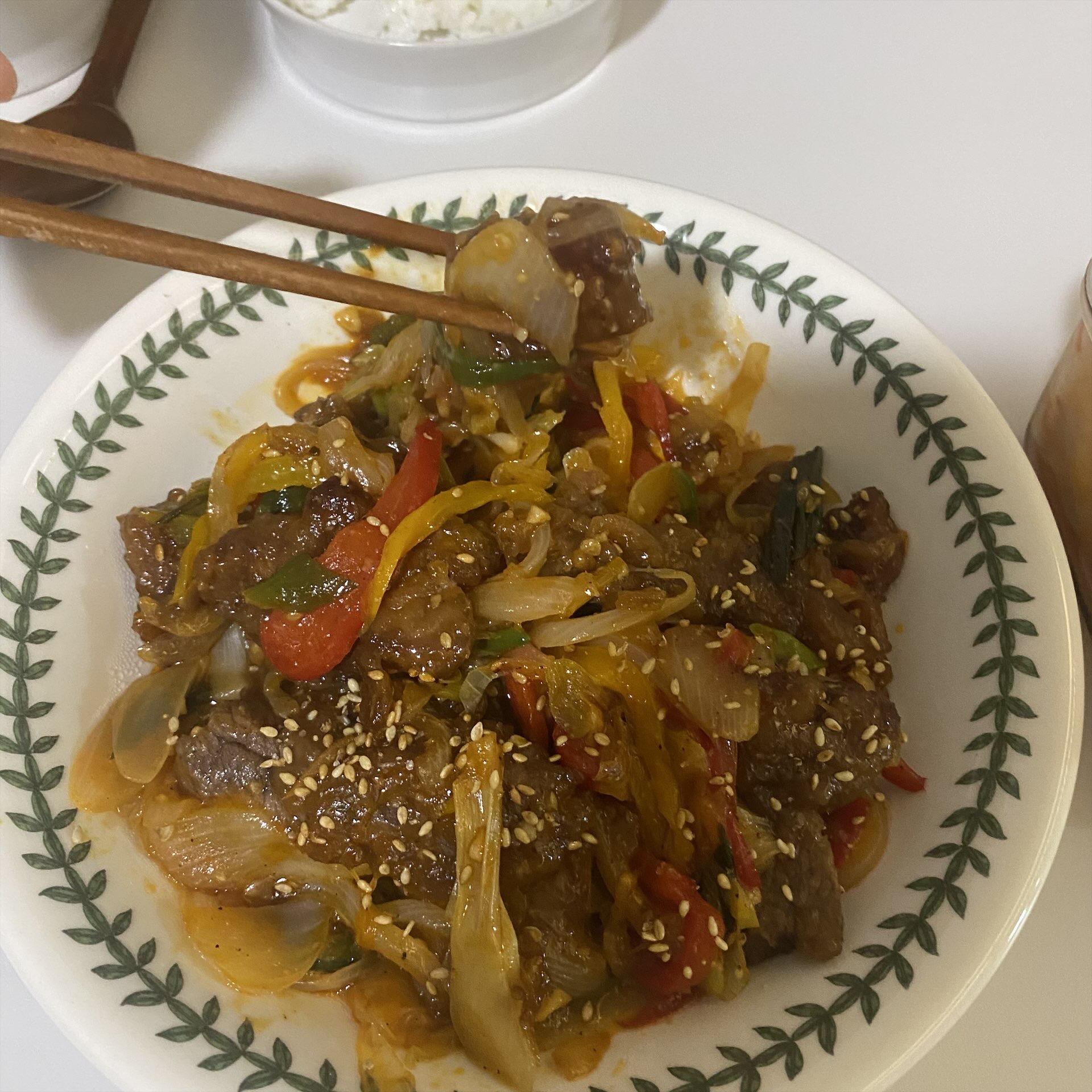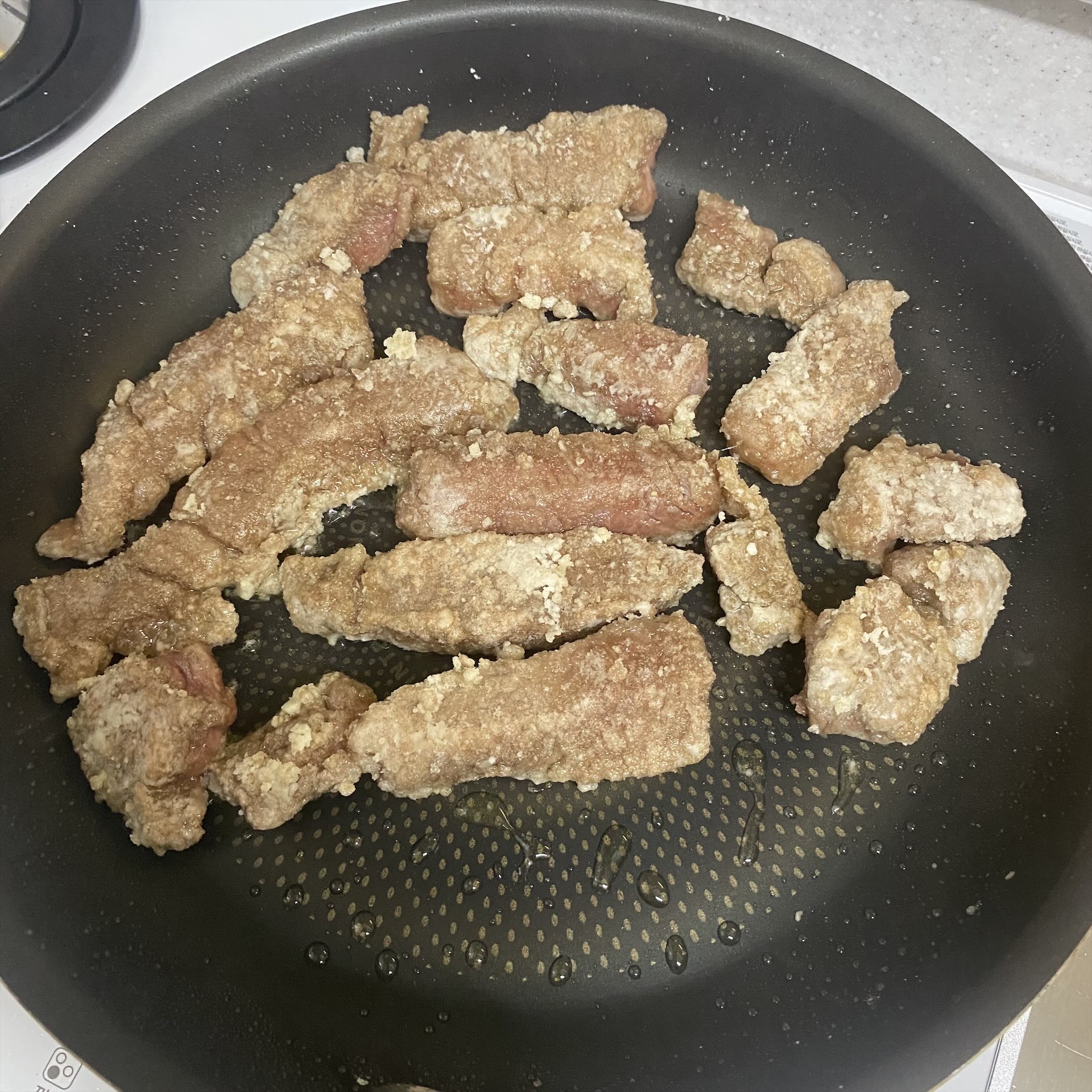 달궈진 팬에 기름을 두르고 소고기를 볶아주세요.
