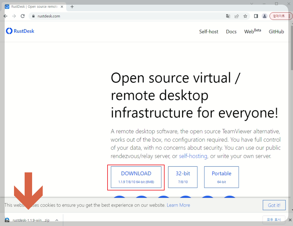 - RustDesk 사이트( https://rustdesk.com/ )로 접속해서 클라이언트를 다운로드 받는다.