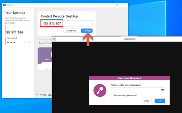 - Control Remote Desktop 박스에 접속할 ID를 적고, Connect 버튼을 누른다.