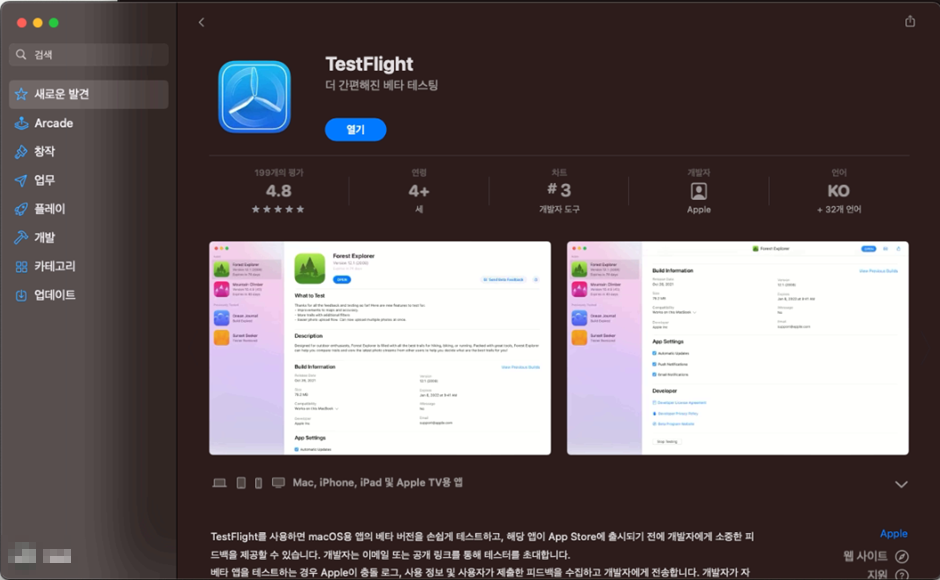 - TestFlight 를 앱스토어에서 검색하여 설치한다. ( iPhone에서 테스트 할때도 동일하게 앱스토어에서 검색해서 설치하면 된다.)