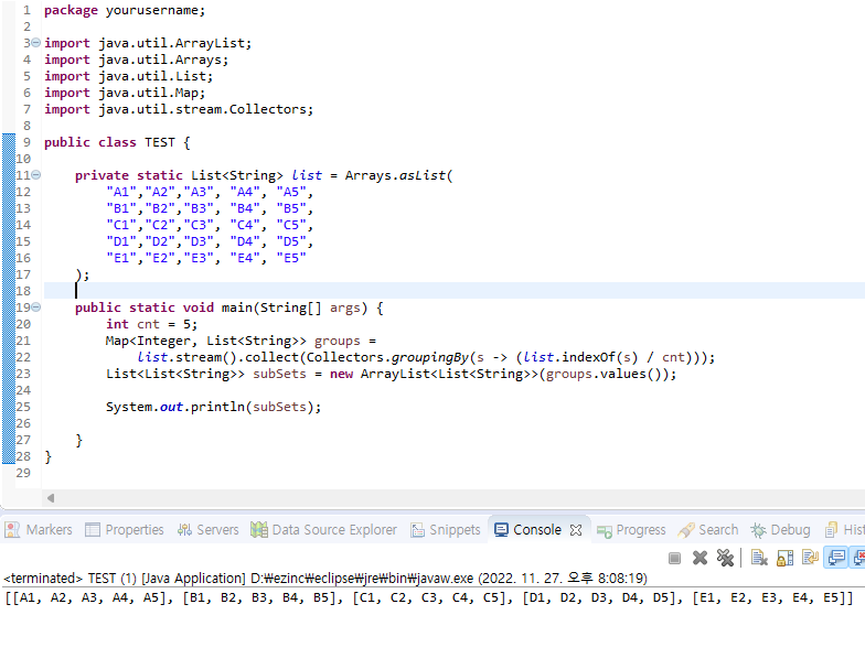 대상리스트.stream().collect(Collectors.groupingBy(s -> (대상리스트.indexOf(s) / 분할할 크기)));