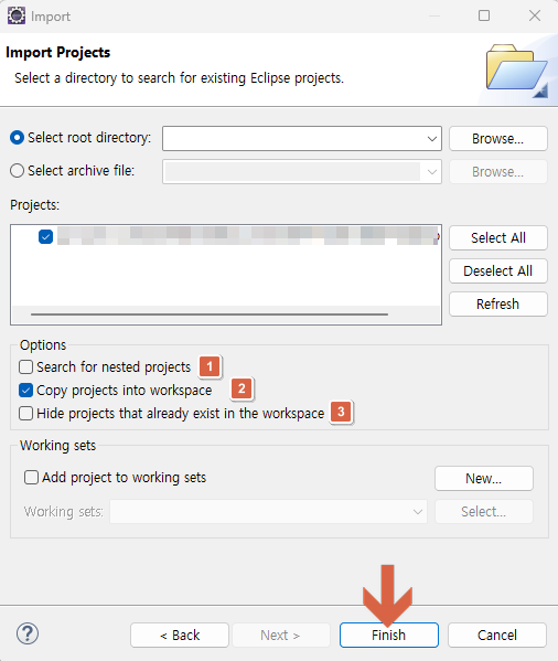 | 3. Hide projects that already exist in the workspace | 작업영역에 이미 프로젝트가 존재하면 숨기기 (선택된 프로젝트가 이미 존재하면 Projects: 창에 표시된 프로젝트를 숨겨준다) |