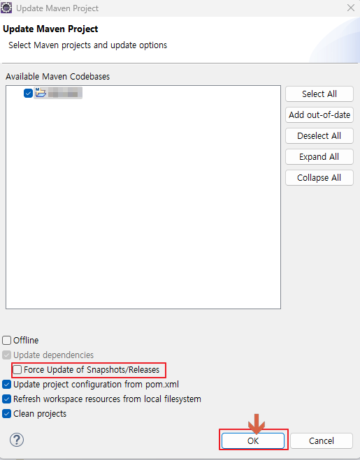 - Maven > Update Project... 를 선택하면 Update maven Project 팝업이 뜨는데, Force Update of Snapshots/Releases 에 체크하고 Ok 버튼을 눌러준다.