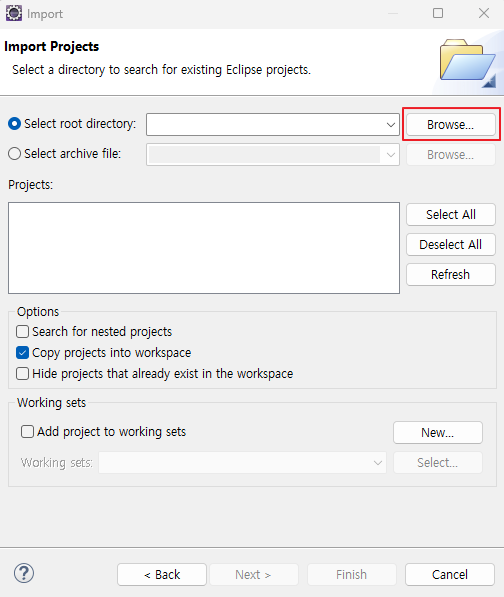 - Import 창이 나오는데 Select root directory 항목에 Browse.. 버튼을 눌러 프로젝트를 선택해준다.