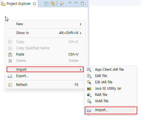 - 마우스 오른쪽 버튼을 누르면 콘텍스트 메뉴가 뜨는데, Import > Import.. 를 선택해준다.