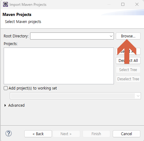 - Import Maven Projects 창이 뜨는데, Browse.. 버튼을 눌러 추가할 Maven 프로젝트를 선택해준다.